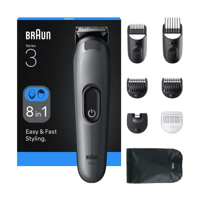 JoybuyThe Braun All-in-One Series 3, 8in1 Grooming Kit (AIO3540) features sharp DualCut stainless steel blades, 39 length settings, and 9 versatile attachments for beard, hair, body, and facial grooming. Its waterproof, ergonomic design offers up to 100 minutes of cordless use with fast charging.