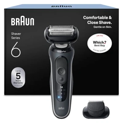 Comfortable & efficient shave: Braun's Series 6 electric shaver offers a comfortable and efficient shave that is gentle on skin 2D Contour Adaptation: Contour Adaption Head minimizes pressure for a close and comfortable shave Shave modes: Braun Series 6 has 2 shave modes. Turbo for an extra fast shave and Gentle for a comfortable shave Complete Grooming Kit: Bring your grooming routine to the next level with Precision Trimmer attachment for versatile grooming and styling Made in Germany, built to last for years: The shaver is 100% waterproof for wet & dry use. Up to 60-min Li-Ion battery runtime and 5-min quick charge for one shave