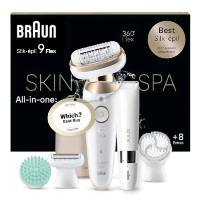 Braun Silk épil 9 Flex SkinSpa, Epilator with 360 Flexible Head for Easy Hair Removal, Wet & Dry, Lasting Smooth Skin, All in One Kit, Body Mini Shaver, 481 3D, White/Gold