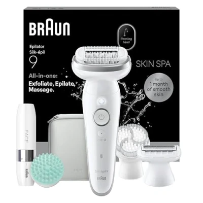 Braun Silk·épil 9 SkinSpa, All in One Set, Epilator with Pivoting Head for Easy Hair Removal, Wet & Dry, Lasting Smooth Skin, Includes Exfoliation Brush, Massage Pad, Shaver Head, Trimmer Comb