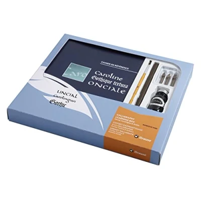 Brause 133B a learning set containing 3 Bandzug nibs (1.5mm, 2.5mm, 5mm), nib holder, brush, 15 ml bottle of Jacques Herbin black ink and booklet in French