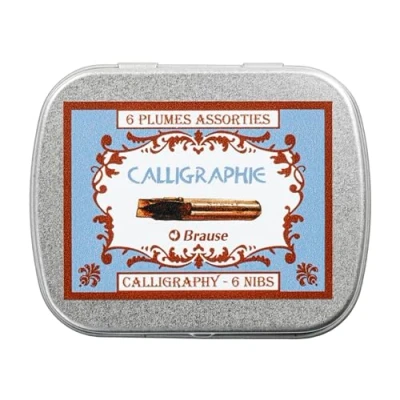 The Bandzug nib is a bronze nib with a small escutcheon-shaped reservoir on top. Perfectly suited to calligraphy (the art of shaping characters). With its sharp angles, the Bandzug nib produces incomparable Gothic lettering. 3 sizes: 0, 7 mm, 2 mm and 3 mm X 2 nibs in box. Made in Germany