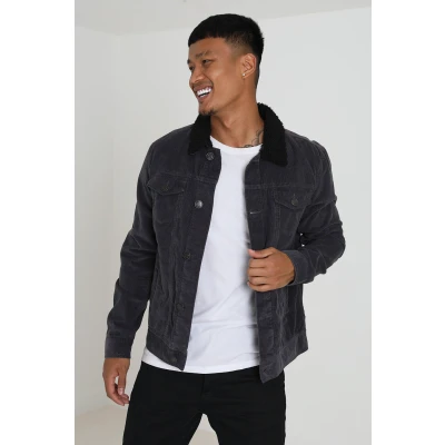 BRAVE SOUL Mens Prestwich Corduroy Jacket Borg Collar Button Up Winter Coat Grey/Black S