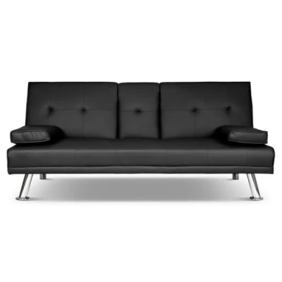 Bravich Manhattan 2 Seater Sofa Bed Black. Faux Leather Fabric With Cup Holder, Folding To Double Bed. Click Clack For Living Room & Space Saving Furniture