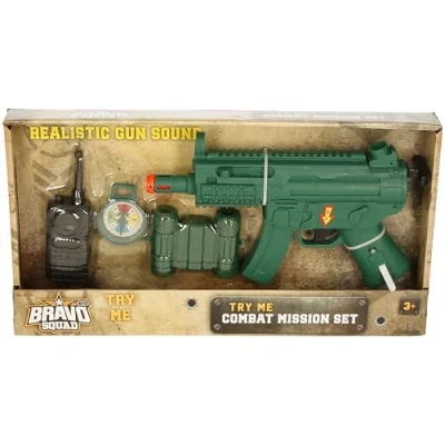 COMPLETE SET: Combat mission toy set includes a green toy gun with realistic sound effects, walkie-talkie, compass, and tactical accessories REALISTIC FEATURES: Toy gun produces authentic sound effects for an immersive play experience, perfect for imaginative missions TACTICAL GEAR: Set comes with essential mission equipment including a functional compass and communication device for enhanced roleplay AGE APPROPRIATE: Designed for children aged 3 years and above, with safety-conscious construction and child-friendly materials MISSION READY: Durable green military-style design with tactical details makes this set ideal for adventure play scenarios, Manufacturer: Bravo Squad