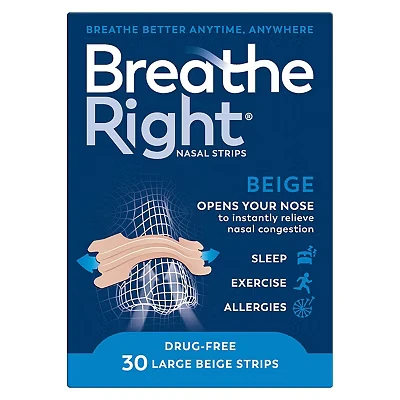 NASAL STRIPS made from breathable and form‑fitting material that comfortably adheres once exposed to air, our drug‑free nasal strips are made to stay put, no matter the activity. Flexible spring‑like snore strips bands physically open your nose to instantly relieve nasal congestion, improve airflow and reduce snoring ANTI SNORING Breathe Right nose strips help reduce snoring and by doing so, promote improved sleep quality. Drug-free snoring aid for men & women helps you breathe better and wake up refreshed. Simple and safe to use. Provide up to 12 hours of continuous relief. USE FOR: Our nasal strips aren’t just for snoring. Breathe Right nose strips instantly relieve blocked nose that can arise from colds, seasonal allergies & a deviated septum. It can also be used during exercise as a nostril opener to get more air. Suitable for running, sports, sinus relief. HOW IT WORKS The instant you place the nose strip across the bridge of your nose (just above your nostrils) you feel our bands start working. They’re flexible enough to curve with your nose, but strong enough to have a natural resistance to bending—which is how they lift your nostrils open, ever so gently. COMES IN: 10 and 30 count packages: Small/medium and large sizes. Original Beige and Clear colours. Use the right size for best results. Small/medium nasal strips fit 75% of noses, large nasal strips are for adults with a larger nose BREATHE EASIER, knowing that drug‑free Breathe Right nasal strips offer instant relief—anytime, anywhere nasal congestion strikes. The package is sealed with natural rubber latex, which may cause allergic reactions. Always read the label. TRUSTED RELIEF: Backed by thousands of satisfied customers, Breathe Right strips are a trusted solution for improving breathing and sleep quality.