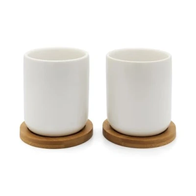 The tea mug set consists of 2 white ceramic cups and a wooden coaster The matching brown wooden coasters prevent any edges or stains on your table Each of the white mugs has a diameter of approx. 8 cm and a height of approx. 9 cm The tea cup set has 200 ml capacity and is not dishwasher safe The ceramic cups in a set of 2 can be washed with a little water and let it dry