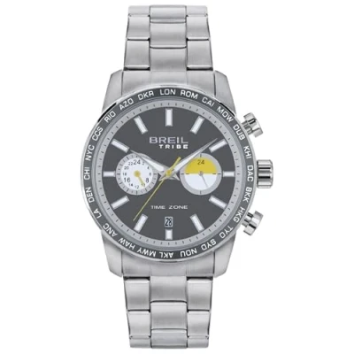 The men's watch from the Zone collection has a double schedule movement that gives it a unique and original character The two indicators of the grey dial and the second hand have a contrast of ocher yellow details The aluminum bezel combines with the dial for a youthful and bold air Watch with double schedule and movement VD31, water resistance 5 ATM BREIL is a unique brand of steel watches and jewelry with original designs and exquisitely Italian style