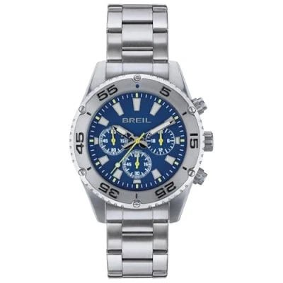 The men's chronograph from the Breil brand from the Chrono collection impresses with its sporty character and combines technology and design The round steel housing enhances the design and ensures a high recognition value The blue dial with yellow second hand has a separate second display, luminescent hands and index markings The sporty watch is closed with a practical folding clasp The watch has a water resistance of 10 bar (suitable for swimming and snorkelling)