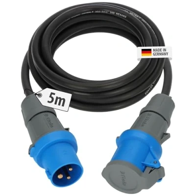 The extremely robust and high-quality CEE Extension Cable with a length of 5m and cable designation H07RN-F 3G2.5 is ideal as a camping cable for reliable outdoor power supply The Camping Extension Lead is equipped with a robust CEE plug 16A and a CEE coupling with protective cover, ensuring a safe connection Thanks to IP44 protection and the RN cable, the Extension Cable is perfectly suited for continuous outdoor use as a caravan extension or camping cable The durable Camping Extension Cable is made of extremely robust material and is perfect for all types of caravans and motorhomes The CEE Extension Lead with 230V, 5m length and black cable is the ideal solution for camping, outdoor activities and safe outdoor connections