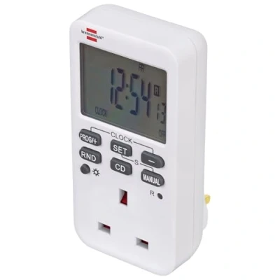 Digital timer with extra large display, countdown, random function and increased touch protection The minimum switching interval of the timer is 1 minute Easy operation enables 10 on/off programs with weekday, hour and minute settings With countdown/random and manual on/off function - the random function is used to set a random switch-on time of 10 to 31 minutes between 6 p.m. and 6 a.m. Comfort-Line timer in the colour white, incl. NiMH rechargeable battery with data storage in the event of a power failure