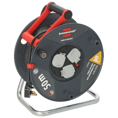 Brennenstuhl Garant Cable Reel 50m (Made in Germany, Extension Lead with 3 sockets and Thermal Cut Out Protection, Ergonomic Handle)