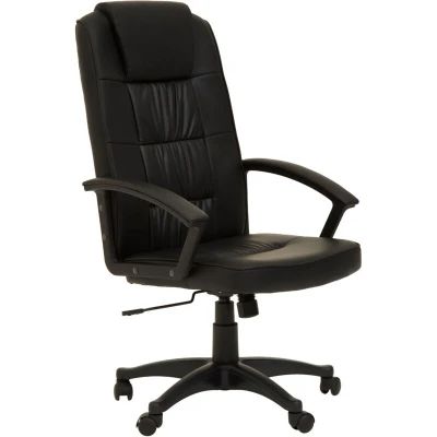 ManoManoGeneral description This high back home office chair features an extended upper back with integrated headrest support to enhance posture, along with generously padded loop arms. Upholstered in black leather effect fabric, it is supported by a sturdy black base.