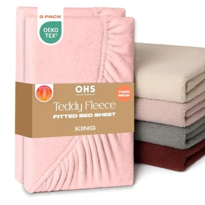 Teddy Fleece Fitted Sheet King Size: The pink fitted sheet king size fleece bed sheet made from soft teddy fleece fabric, ensuring a smooth and comfortable feel throughout the summer and winter months. 152cm x 200cm: King size fitted sheet 2 pack with elasticated edges that measure 25cm when applied to mattress. Easy application teddy bear fitted sheet makes taking off and putting super easy. Teddy fitted sheet are machine washable at 40°C. Ultra soft luxurious king size bed sheet 2 pack guarantees a relaxing and restful sleep, night after night. Teddy fleece fitted sheet doesn't stick or feel too clammy against skin, with fine fluffy fabric perfect for those with sensitive skin. Fade and wrinkle resistant king size sheet fitted that are highly durable and last longer than regular bed king size sheet. Easy care king size bed sheet made from breathable 100% polyester with 150gsm teddy fleece material. Luxury king size fitted sheets gift for new homeowners or friends and family restyling their bedroom decor. Perfect fluffy bedding cover sheets present for Birthdays, Mother’s Day, Father’s Day or Christmas. Includes 2 x King size teddy bear fitted sheet
