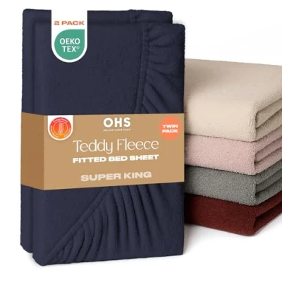 Super King Bed Sheets: The vibrant navy blue fluffy bedding fitted sheet super king size made from soft teddy fleece fabric, ensuring a smooth and comfortable feel throughout the summer and winter months. 183cm x 200cm: Superking fitted sheets 2 pack with elasticated edges that measure 25cm when applied to mattress. Easy application teddy bear fitted sheet makes taking off and putting super easy. Teddy fitted sheet are machine washable at 40°C. Ultra soft luxurious 2 pack superking fitted sheet guarantees a relaxing and restful sleep, night after night. Fitted sheets super king size doesn't stick or feel too clammy against skin, with fine fluffy fabric perfect for those with sensitive skin. Fade and wrinkle resistant super king fitted sheet that are highly durable and last longer than regular bed super king sheet. Easy care super king bed sheet made from breathable 100% polyester with 150gsm teddy fleece material. Perfect superking fitted sheet present for Birthdays, Mother’s Day, Father’s Day or Christmas. Luxury superking fitted sheets bedding gift for new homeowners or friends and family restyling their bedroom decor. Includes 2 x Superking teddy bear fitted sheet