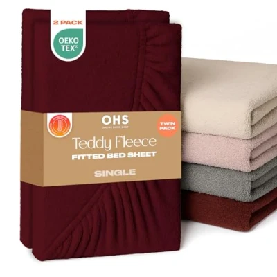 Fitted Sheet Single Bed: Burgundy red fluffy bedding single fitted sheet made from soft teddy fleece fabric, ensuring a smooth and comfortable feel throughout the summer and winter months. 91cm x 190cm: Single fitted sheets 2 pack with elasticated edges that measure 25cm when applied to mattress. Easy application teddy bear fitted sheet makes taking off and putting super easy. Teddy fitted sheet are machine washable at 40°C. Ultra soft luxurious single sheets 2 pack guarantees a relaxing and restful sleep, night after night. Single bed sheets fitted doesn't stick or feel too clammy against skin, with fine fluffy fabric perfect for those with sensitive skin. Fade and wrinkle resistant single fitted sheet that are highly durable and last longer than regular bed single sheet. Easy care single bed sheets made from breathable 100% polyester with 150gsm teddy fleece material. Luxury single fitted sheet set gift for new homeowners or friends and family restyling their bedroom decor. Perfect fitted single sheet present for Birthdays, Mother’s Day, Father’s Day or Christmas. Includes 2 x Single teddy bear fitted sheet