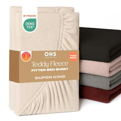 Teddy Fleece Fitted Sheet Super King: The soft cream beige fluffy bedding super king sheet fitted made from soft teddy fleece fabric, ensuring a smooth and comfortable feel throughout the summer and winter months. 183cm x 200cm: Superking fitted sheets 2 pack with elasticated edges that measure 25cm when applied to mattress. Easy application teddy bear fitted sheet makes taking off and putting super easy. Teddy fitted sheet are machine washable at 40°C. Ultra soft luxurious 2 pack superking fitted sheet guarantees a relaxing and restful sleep, night after night. Fitted sheets super king size doesn't stick or feel too clammy against skin, with fine fluffy fabric perfect for those with sensitive skin. Fade and wrinkle resistant super king fitted sheet that are highly durable and last longer than regular bed super king sheet. Easy care super king bed sheet made from breathable 100% polyester with 150gsm teddy fleece material. Perfect superking fitted sheet present for Birthdays, Mother’s Day, Father’s Day or Christmas. Luxury superking fitted sheets bedding gift for new homeowners or friends and family restyling their bedroom decor. Includes 2 x Superking teddy bear fitted sheet