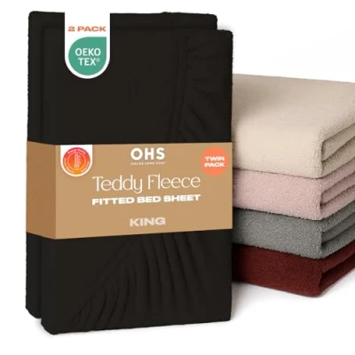 Teddy Fleece Fitted Sheet King Size: Luxurious black fluffy bedding fitted sheet made from teddy thermal fleece material, ensuring a smooth and comfortable feel throughout the summer and winter months. 152cm x 200cm: King size fitted sheet 2 pack with elasticated edges that measure 25cm when applied to mattress. Easy application teddy bear fitted sheet makes taking off and putting super easy. Teddy fitted sheet are machine washable at 40°C. Ultra soft luxurious king size bed sheet 2 pack guarantees a relaxing and restful sleep, night after night. Teddy fleece fitted sheet doesn't stick or feel too clammy against skin, with fine fluffy fabric perfect for those with sensitive skin. Fade and wrinkle resistant king size sheet fitted that are highly durable and last longer than regular bed king size sheet. Easy care king size bed sheet made from breathable 100% polyester with 150gsm teddy fleece material. Luxury king size fitted sheets gift for new homeowners or friends and family restyling their bedroom decor. Perfect fleece bedding cover sheets present for Birthdays, Mother’s Day, Father’s Day or Christmas. Includes 2 x King size teddy bear fitted sheet