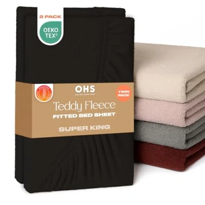 Teddy Fleece Fitted Sheet Super King: Luxurious black fluffy bedding fitted sheet made from teddy thermal fleece material, ensuring a smooth and comfortable feel throughout the summer and winter months. 183cm x 200cm: Superking fitted sheets 2 pack with elasticated edges that measure 25cm when applied to mattress. Easy application teddy bear fitted sheet makes taking off and putting super easy. Teddy fitted sheet are machine washable at 40°C. Ultra soft luxurious 2 pack superking fitted sheet guarantees a relaxing and restful sleep, night after night. Fitted sheets super king size doesn't stick or feel too clammy against skin, with fine fluffy fabric perfect for those with sensitive skin. Fade and wrinkle resistant super king fitted sheet that are highly durable and last longer than regular bed super king sheet. Easy care super king bed sheet made from breathable 100% polyester with 150gsm teddy fleece material. Perfect superking fitted sheet present for Birthdays, Mother’s Day, Father’s Day or Christmas. Luxury fleece fitted sheet fluffy bedding gift for new homeowners or friends and family restyling their bedroom decor. Includes 2 x Superking teddy bear fitted sheet