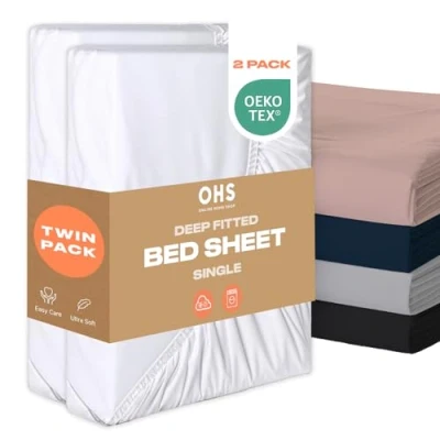Student Bedding Bundle Single: White deep fitted sheets made from soft microfibre fabric, ensuring a smooth and comfortable feel throughout the summer and winter months. Ultra soft luxurious microfibre single bed sheets guarantees a relaxing and restful sleep, night after night. Single bed sheets fitted does not stick or feel too clammy against skin, with fine velvety fabric perfect for those with sensitive skin. 91cm x 190cm: Single bed sheets fitted pack of 2 with elasticated edges that measure 30cm when applied to mattress. Easy application deep fitted sheets makes taking off and putting super easy. Fade and wrinkle resistant single bed sheet deep fitted that are highly durable and last longer than regular bed single sheet. Easy care single deep fitted sheets made from breathable 100% soft polyester material. Single bed sheets fitted that are machine washable at 40°C. Tumble dry and iron on low heat. Luxury bed sheets set gift for new homeowners or friends and family restyling their bedroom decor. Perfect single deep fitted sheet present for Birthdays, Mothers Day, Fathers Day or Christmas. Includes 2 x Single Fitted Sheets.