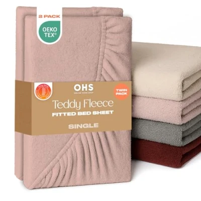 Single Bed Sheets: This elegant blush pink shade teddy bear bedding single fitted sheet made from teddy thermal fleece material, ensuring a smooth and comfortable feel throughout the summer and winter months. 91cm x 190cm: Single fitted sheets 2 pack with elasticated edges that measure 25cm when applied to mattress. Easy application teddy bear fitted sheet makes taking off and putting super easy. Teddy fitted sheet are machine washable at 40°C. Ultra soft luxurious single sheets 2 pack guarantees a relaxing and restful sleep, night after night. Single bed sheets fitted doesn't stick or feel too clammy against skin, with fine fluffy fabric perfect for those with sensitive skin. Fade and wrinkle resistant single fitted sheet that are highly durable and last longer than regular bed single sheet. Easy care single bed sheets made from breathable 100% polyester with 150gsm teddy fleece material. Luxury single fitted sheet set gift for new homeowners or friends and family restyling their bedroom decor. Perfect fitted single sheet present for Birthdays, Mother’s Day, Father’s Day or Christmas. Includes 2 x Single teddy bear fitted sheet