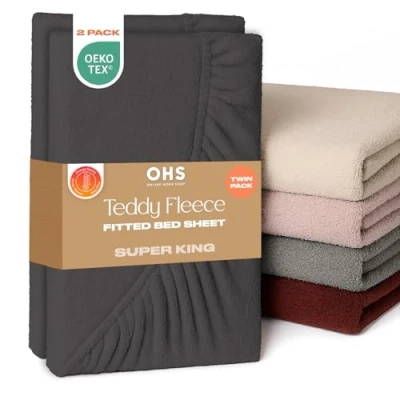 Super King Fitted Sheets: The rich charcoal grey teddy fleece fitted sheet made from soft teddy fleece fabric, ensuring a smooth and comfortable feel throughout the summer and winter months. 183cm x 200cm: Superking fitted sheets 2 pack with elasticated edges that measure 25cm when applied to mattress. Easy application teddy bear fitted sheet makes taking off and putting super easy. Teddy fitted sheet are machine washable at 40°C. Ultra soft luxurious 2 pack superking fitted sheet guarantees a relaxing and restful sleep, night after night. Fitted sheets super king size doesn't stick or feel too clammy against skin, with fine fluffy fabric perfect for those with sensitive skin. Fade and wrinkle resistant super king fitted sheet that are highly durable and last longer than regular bed super king sheet. Easy care super king bed sheet made from breathable 100% polyester with 150gsm teddy fleece material. Perfect superking fitted sheet present for Birthdays, Mother’s Day, Father’s Day or Christmas. Luxury superking fitted sheets bedding gift for new homeowners or friends and family restyling their bedroom decor. Includes 2 x Superking teddy bear fitted sheet