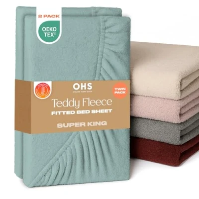 Super King Fitted Sheet 2 Pack: The beautiful duck egg fleece bedding fitted sheet super king made from soft teddy fleece fabric, ensuring a smooth and comfortable feel throughout the summer and winter months. 183cm x 200cm: Superking fitted sheets 2 pack with elasticated edges that measure 25cm when applied to mattress. Easy application teddy bear fitted sheet makes taking off and putting super easy. Teddy fitted sheet are machine washable at 40°C. Ultra soft luxurious 2 pack superking fitted sheet guarantees a relaxing and restful sleep, night after night. Fitted sheets super king size doesn't stick or feel too clammy against skin, with fine fluffy fabric perfect for those with sensitive skin. Fade and wrinkle resistant super king fitted sheet that are highly durable and last longer than regular bed super king sheet. Easy care super king bed sheet made from breathable 100% polyester with 150gsm teddy fleece material. Perfect superking fitted sheet present for Birthdays, Mother’s Day, Father’s Day or Christmas. Luxury superking fitted sheets bedding gift for new homeowners or friends and family restyling their bedroom decor. Includes 2 x Superking teddy bear fitted sheet