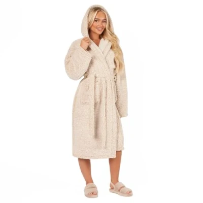 Brentfords Teddy Marl Beige Ladies Dressing Gown, Soft Warm Comfy Womens Hooded Gowns Luxury Oversized Fluffy One Size