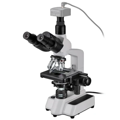 High quality microscope for high expectations Dimmable 20W halogen light 360 rotating tower / Crosstable Additional third connector for connecting a camera or PC eyepiece Included: Microscope, Eyepieces (2x DIN WF10x), Lenses (4x,10x,40x,100x), Abbe condensor, immersion oil The BRESSER Researcher Trino is a very popular microscope, which is widely used in schools, for hobby and standard laboratory tasks. Mount a camera on the separate tube and set it parfocal. Makes microphotography easy and convenient. Four DIN/RMS high quality achromatic objectives 4x; 10x; 40x; 100x oil and a set of 10x wide field eyepieces gives a magnification range from 40x to 1000x. Trinocular head for comfortable viewing and microphotography, Interpupilary distance and diopters are adjustable. Abbe type condensor (N.A. 1.25) with iris, fully adjustable. Solid and heavy metal body with precise and durable mechanics. Coarse and fine focus, mechanical stage with vernier scales and low coax controls for ergonomic handling. Upgradeable with: dark field condensors, phase contrast set, high quality planachromatic objectives or a MikroCam camera (or adapt your own camera on the separate camera tube). The Bresser Researcher Trino matches your needs! Objectives 40x and 100x spring loaded against accidental damage, height of the table can be limited as well. Besides this, relax and rely on our 5 years manufacturers warranty!