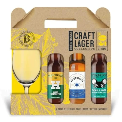 Brewhouse Craft Lager Collection set, including three 330ml bottles of Lagers (Harbour Brewing/Freedom Brewing/Harviestoun Brewery). Perfect for Christmas, Birthdays and Father’s Day.