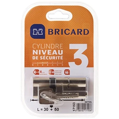 BRICARD 17153 Double Astral 2.9 10 Nickel Plated Brass Cylinder Piston Input, Personal Protection Against Drilling and Picking. Card., Steel, 80 = 30 + 50