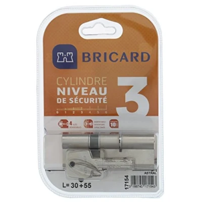 Double Entry cylinder Astral 2, 9 In Nickel Plated Brass 10 pistons, 2 30 + 55, protection against drilling and picking. Personal Card. 4 interchangeable keys. Protection against picking. Double Entry cylinder Astral 2.9 in nickel plated brass 10 pistons, 2 30 + 55, protection against drilling and picking. Personal Card. Security Level 3., Manufacturer: BRICARD