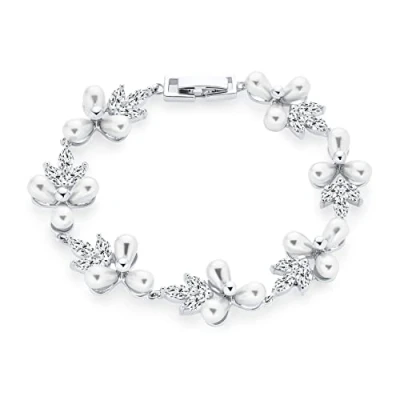 Bridal Wedding Multi Flowers CZ Leaf Genuine White Freshwater Cultured Pearl Bracelet For Women Silver Plated 7 Inch