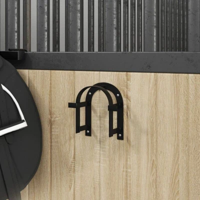 ManoManoGeneral description The horse bridle rack is an effective solution for storing messy reins, helping to keep your stable clean and tidy. This versatile bridle hanger is designed for hanging bridles, horse ropes, accessories, jackets, belts, and more, making it suitable for use in barns, tack rooms, stables, garages, entryways, and coat rooms. Technical specifications Colour: Black Material: Powder-coated iron Dimensions: 16.5 x 7 x 16.5 cm (L x W x H) Other information The mounting screws are not included.