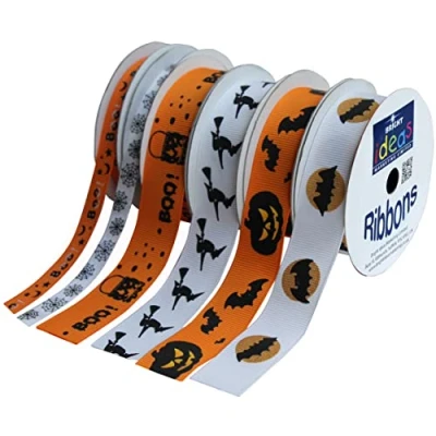 Bright Ideas 6 Pack 5m X 9mm & 22mm Lengths, 30M Value of Printed Halloween Cross Grain Ribbon Bundle, Assorted for Crafts Gift Wrapping, Wedding Party Decoration