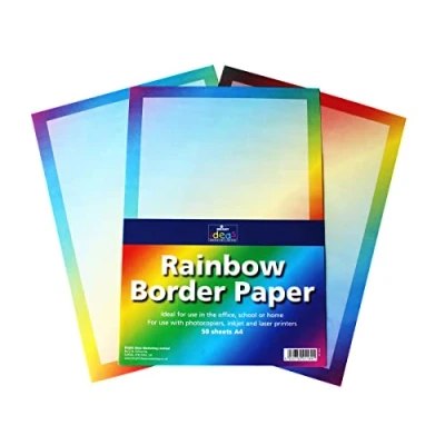 Bright Ideas 50 Rainbow border paper sheets are supplied flat and then supplied in a clear polybag with A5 paper insert for extra protection from dust and moisture – Please note that product colour may slightly vary due to photographic lighting sourcing Each bright and colourful Rainbow border paper sheet is 90gsm and finished in a bright and colourful rainbow finish and measures A4. 29.7cm x 21cm in size and are a solid colour on the front with a white backing These paper and card sheets available in the Bright Ideas range are made from a wide variety of thickness and gsm, easy to bend, fold, shape, glue and turn into whatever you’d like, they can be cut into the proper size at will, single sheet or multiple sheets can be stacked for your needs Perfect for classroom crafting and most arts and crafts, colourful paper and card sheets will be a great addition to your arts & crafts supplies. Ideal for all DIY projects like card making, die cutting, scrapbooking, greeting cards, papier Mache This pack of paper is ideal for use with photocopiers, inkjet, and laser printers – we advise printing a test page first as all printers vary in spec, but this does give a stunning base to print on