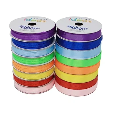 Bright Ideas satin ribbons are supplied rolled onto a cardboard spool and then wrapped in a clear strong polybag for extra protection from dust and moisture - Please note that product colour may slightly vary due to photographic lighting sourcing Pack of 16 assorted coloured satin ribbons come in the following bright and bold colours which you get 8 x colours Blue, Orange, Red, Light Pink, Light Blue, Yellow, Green, and Purple. You will get two sets of widths of ribbon, 3mm and 9mm wide with each satin ribbon measuring approximately 7.5 meters in length Each pack contains 120 meters of ribbon, perfect for Balloon and gift wrapping - ribbon is perfect for use as curling ribbons for gift wrapping, and curling ribbon for balloons plus decorating cakes and other party decorations A perfect pack for all your school craft supplies. Ideal for textile decoration, collage trimming or scrapbooking – plus anything else you can think of! A classic crafting and home craft box must have At Bright Ideas we have a wide range of ribbons from curling, satin, cross grain and much more. From assorted colours, pack sizes and finishes you are sure to find something in our wide and colourful range
