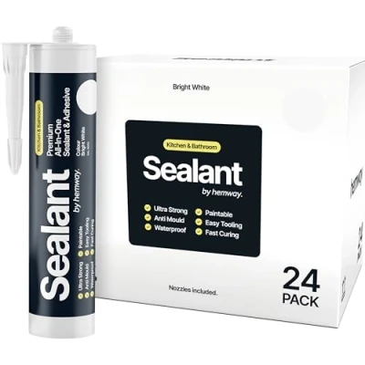 Bright White 300ml Hybrid Polymer Sealant Adhesive Kitchen Bathroom Sanitary Anti Mould Easy Tool Odourless Paintable Fast Grab No Shrink Worktop Tile Bath Shower Toilet Waterproof Cure 24 Pack