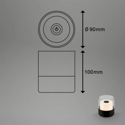 The black mini table lamp is battery operated and can therefore be used as a mobile light in your home. The battery lasts up to 15 hours, the charging time is 2.5 hours. The included glass makes this battery lamp a decoration The mini battery lamp can be dimmed in 3 levels by touch (20%, 50%, 100%) is suitable as a mobile table light, decorative lamp, decorative light, night light for children and mini bedside lamp The light colour is warm white at 2700 Kelvin and is suitable for barbecues on the garden table on the balcony and terrace or as a cosy light in the living room, hallway and bedroom The protection class IP44 protects the LED table lamp with battery from splashes of water, if it gets wet when camping, outdoors, on the terrace and balcony. The LED lamp is rechargeable via USB-C cable, which is included. The wireless lamp measures 90 x 100 mm (D x H) with glass This product is a surrounding product. Surrounding products are lights that can be disassembled for separate verification of the included light source(s). This product contains a light source of energy efficiency class G