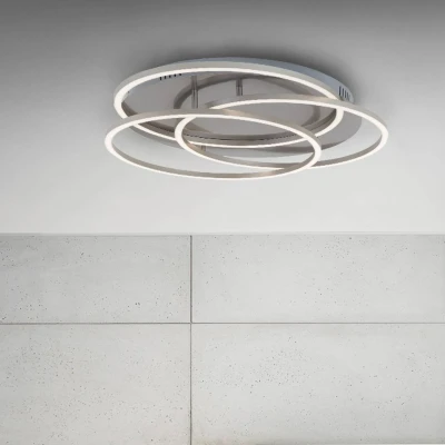 Lights.coDimmable LED ceiling light Frames with three luminous rings The Frames LED ceiling light is equipped with LEDs that are permanently installed on the inner side of the rings. Thus, it emits a bright and glare-free light. The three rings are attached to a ceiling bracket. They create a contemporary look and provide the right light in any living space. The ceiling light offers the possibility to dim in steps via the normal switch on the wall. The integrated memory function ensures that this setting is saved.