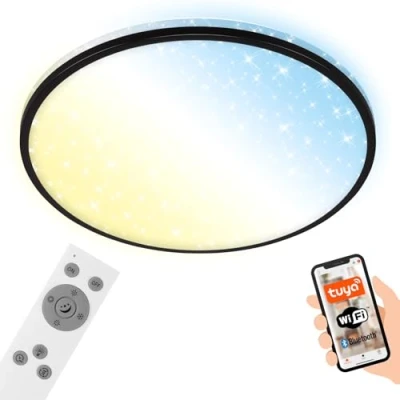 Lights.coDimmable LED ceiling light Ivy Sky S with starry sky effect and CCT function However, the light is particularly impressive thanks to its practical functions. It has a CCT function that allows the colour temperature to be adjusted continuously from warm to daylight. It is also possible to regulate the brightness and use the night light, memory and timer functions. It can be controlled either with the included remote control, by voice command via Amazon Echo or Google Home, or with the free Tuya app via smartphone or tablet. A special visual highlight is the built-in starry sky effect, which creates a pleasant atmosphere in the room. Ivy Sky S is therefore ideal for use in bedrooms or children's rooms, but can also be used in the living room