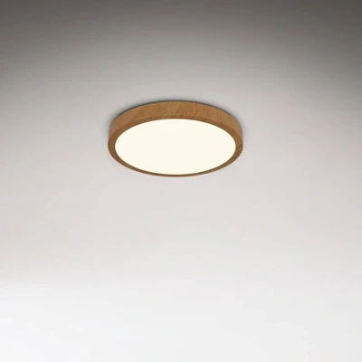 Lights.coFlat LED ceiling light Runa Wood with wood-colored metal frame With the LED ceiling light Runa Wood you can realize a flat general lighting. The round ceiling light has a very slim finish and a wood-colored metal frame. Warm white LEDs were installed behind the satin plastic diffuser and emit light directly downwards