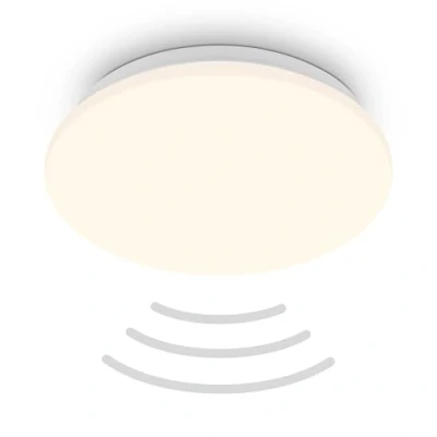 Discreet LED ceiling light with sensor: This slim white light blends subtly into hallways, entrances or basements, providing reliable, automatic illumination where and when it’s needed Built-in microwave sensor: With a 3 m range and 120° detection angle, the motion sensor responds quickly and reliably – ideal for areas with regular foot traffic or frequent movement Soft warm white light at 3,000K: The integrated 13W LED panel delivers 1,300lm of even, glare-free light in a cosy warm white tone, perfect for creating a welcoming and pleasant atmosphere Dusk sensor for efficient use: The ceiling light only activates in low ambient light, saving energy and extending lifespan – ideal for seldom-used or naturally darker spaces like corridors Compact size Ø270x60mm (DxH): Thanks to its low-profile design, this ceiling light is ideal for spaces with limited height such as hallways, utility rooms or storage areas