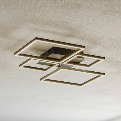 Lights.co4-bulb LED ceiling light Frame in an open, modern design - can be controlled by remote control The modern LED ceiling light Frame consists of four square metal elements - two larger and two smaller open frames. Their undersides are fitted with satinised plastic covers through which the light from the integrated LEDs is diffused and emitted downwards. Frame has numerous functions that can be controlled using the enclosed remote control. The light colour can be infinitely varied between warm white and cool white, and it is also dimmable. This means that the lighting conditions can be optimally adapted to the respective requirements. A Timer and night light function can also be activated using the remote control.