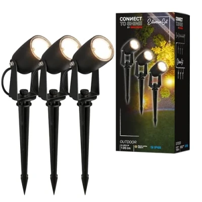 Cosy lighting: Set of three LED spotlights with a power of 2W each, which emit a total of 405 lumens in a warm white colour of 3000K, ideal for ambient lighting of your outdoor space Witterungsbeständig: Mit IP65-Zertifizierung ist die Beetbeleuchtung vollständig staubdicht und gegen Strahlwasser geschützt somit perfekt für den Einsatz im Garten Flexible installation: the dimensions of each fixture are 50x60x225mm, complemented by 0.5m long input/output cables for easy installation on the starter kit Robust material and long service life: made of durable plastic for durable quality, with a lifespan of 25,000 hours and easy assembly thanks to plug-in connections and understandable, multilingual instructions. The system can be easily extended with all Connect to Shine extension kits to light your garden individually and according to your needs This product is a surrounding product. The surrounding products are fixtures that can be disassembled for separate inspection of the included light source(s). This product contains a light source of energy efficiency class G