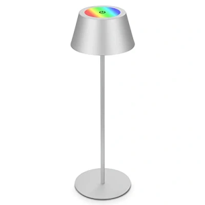 Lights.coLED table lamp Kiki RGBW with rechargeable battery and variable height Kiki is a battery-powered LED table lamp for indoor or outdoor use (IP code IP44) that can shine in bright colours as well as warm white light. The light's two-part rod with screw connections allows the height of the light to be varied. If only one rod is fitted, the table lamp is 22 cm high; if both rods are fitted, the height is 38.5 cm. The table lamp is supplied with a USB charging cable without a mains adapter and can be operated using the touch switch located on the lampshade. Pressing the switch once switches the light to warm white lighting with full luminous intensity, pressing it twice switches on the LED light with reduced luminous intensity and pressing it a third time stops the colour change and the luminous intensity is reduced again. The fourth switching operation switches the light off.