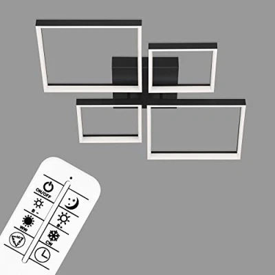 This modern LED ceiling light with four square-shaped LED modules (two of which can be rotated), made from metal and plastic, has a plain black appearance that makes it beautifully eye-catching in all your home spaces - highly versatile, e.g. could be used in the living room or bedroom Both the dimmer and the colour temperature control (2,700 - 6,500 Kelvin, warm to cool white) allow you to fine-tune the lighting to suit your exact needs and preferences Other advantages of this simple ceiling light include a night light and built-in timer - using the remote control, you can adjust the lamp's settings from the comfort of your own sofa Running on a power of 40 watts, the four LED modules stand out with their light output of 4,400 lumens (2 x 1,400 lumens and 2 x 800 lumens), and so emit a warm cosy glow in your home - each bulb has a high average life expectancy of about 25,000 hours Product measurements: 660 x 660 x 90 mm (L x W x H)