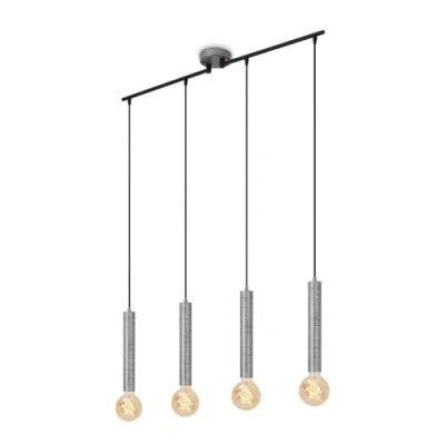 The ceiling light for the dining room impresses with its distinctive retro look with antique silver colour. 4 pendulums hang from the ceiling on narrow, inconspicuous wires The ceiling light has 4 E27 sockets in cylindrical shape for bulbs with max. 60W For a visually harmonious overall picture, the use of a retro light bulb is recommended. Bulb not included This living room lamp has a matt black metal body. With the protection class IP20, the pendant light is only suitable for indoor use This light in a trendy vintage look is perfect for the dining room. It is also well placed in the living room or above the kitchen island The silver crafted pendant light measures 850 x 100 x 1100 mm (L x W x H)