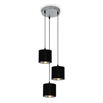 This ceiling light for the dining room impresses with its distinctive retro look with antique silver colour. 3 black fabric shades with silver inner foil create a muted light and are mounted on a wooden beam The ceiling light has 3 E14 sockets for bulbs with max. 25 Watts For a visually harmonious overall picture, the use of retro bulbs is recommended. Bulb not included The fabric shades of the living room lamp are arranged in a rondelle style and at different heights. With the protection class IP20, the pendant light is only suitable for indoor use This light in a trendy vintage look is perfect for the dining room. It is also well placed in the living room or above the kitchen island The pendant light in silver crafted with black textile shade measures 210 x 1200 mm (D x H)
