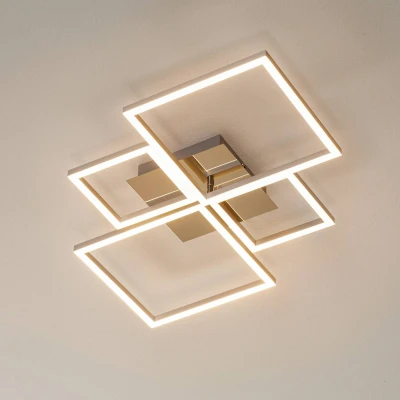 Angular LED ceiling light Frame in chrome and silver The shapely LED ceiling light Frame is not only a good lighting system, but also a visual enrichment for any living space. The airy design of the lamp brings a modern and fresh touch to the room. The light consists of rectangular chrome and silver light elements of different sizes, which are mounted on the ceiling via an equally rectangular cable cover. The rectangles can be swivelled and optimally distribute the light in the room. The intensity of the light can also be adjusted as required using the step dimmer.